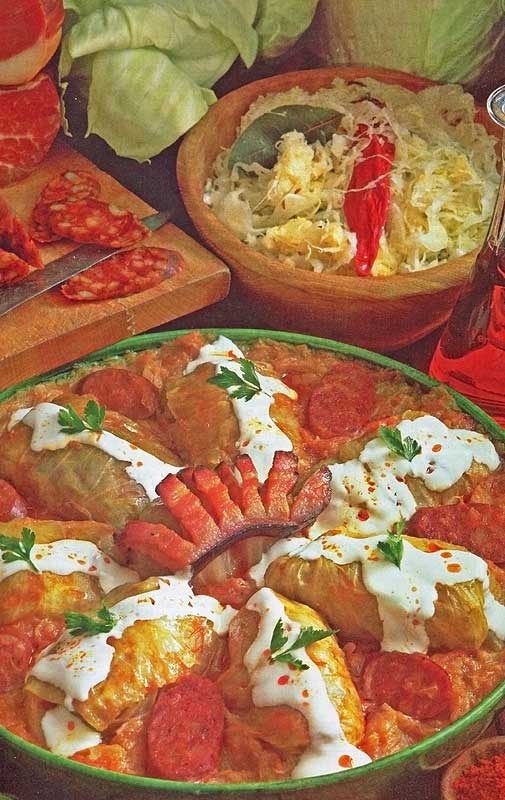 種を取った大きな黄色いパプリカに豚挽肉と米を詰めて煮込み、トマトソースが添えられる「パプリカの肉詰め」もハンガリーの典型的な家庭料理です。肉詰めの料理としてロールキャベツとかぼちゃの肉詰めも挙げられます。